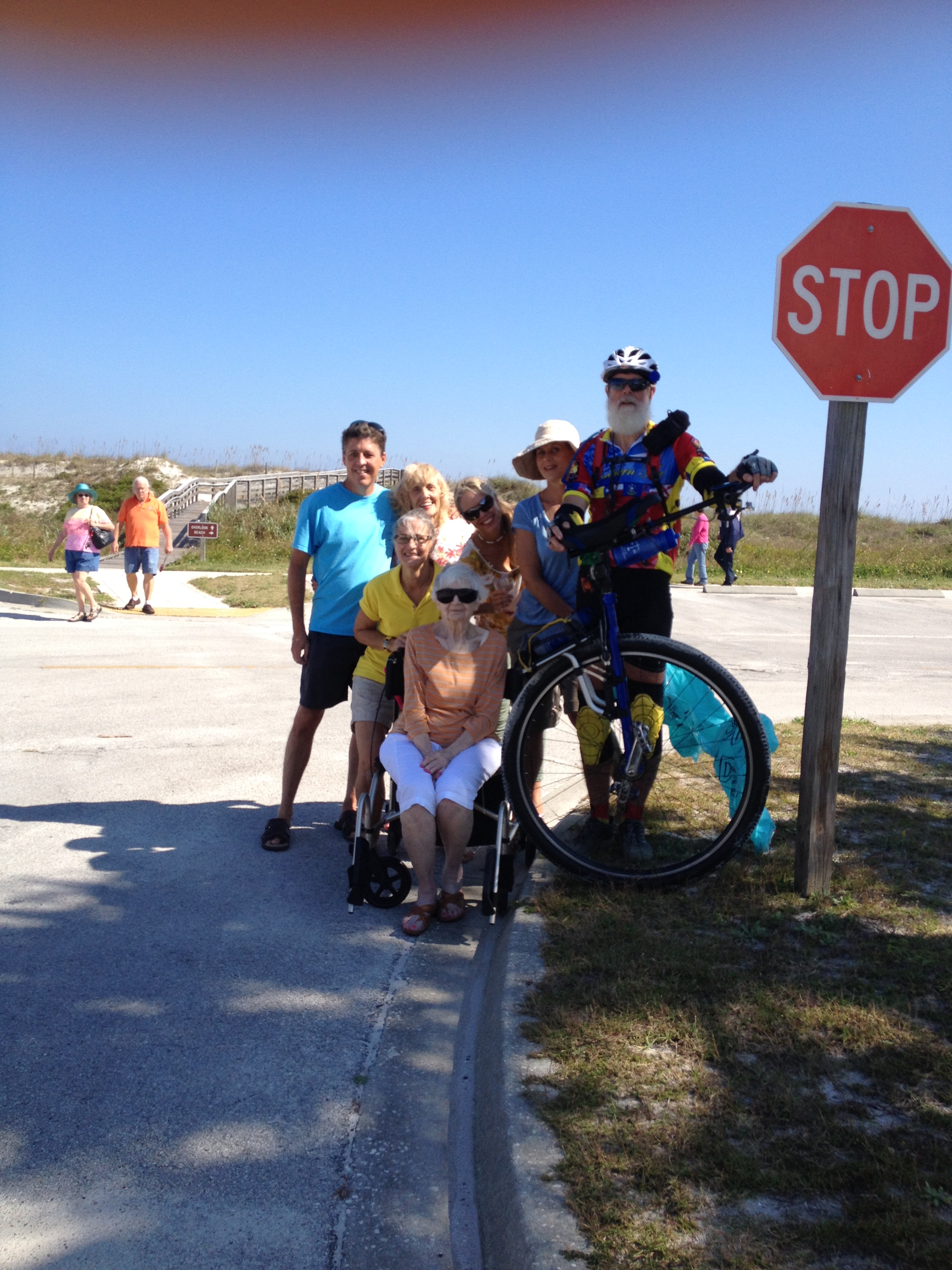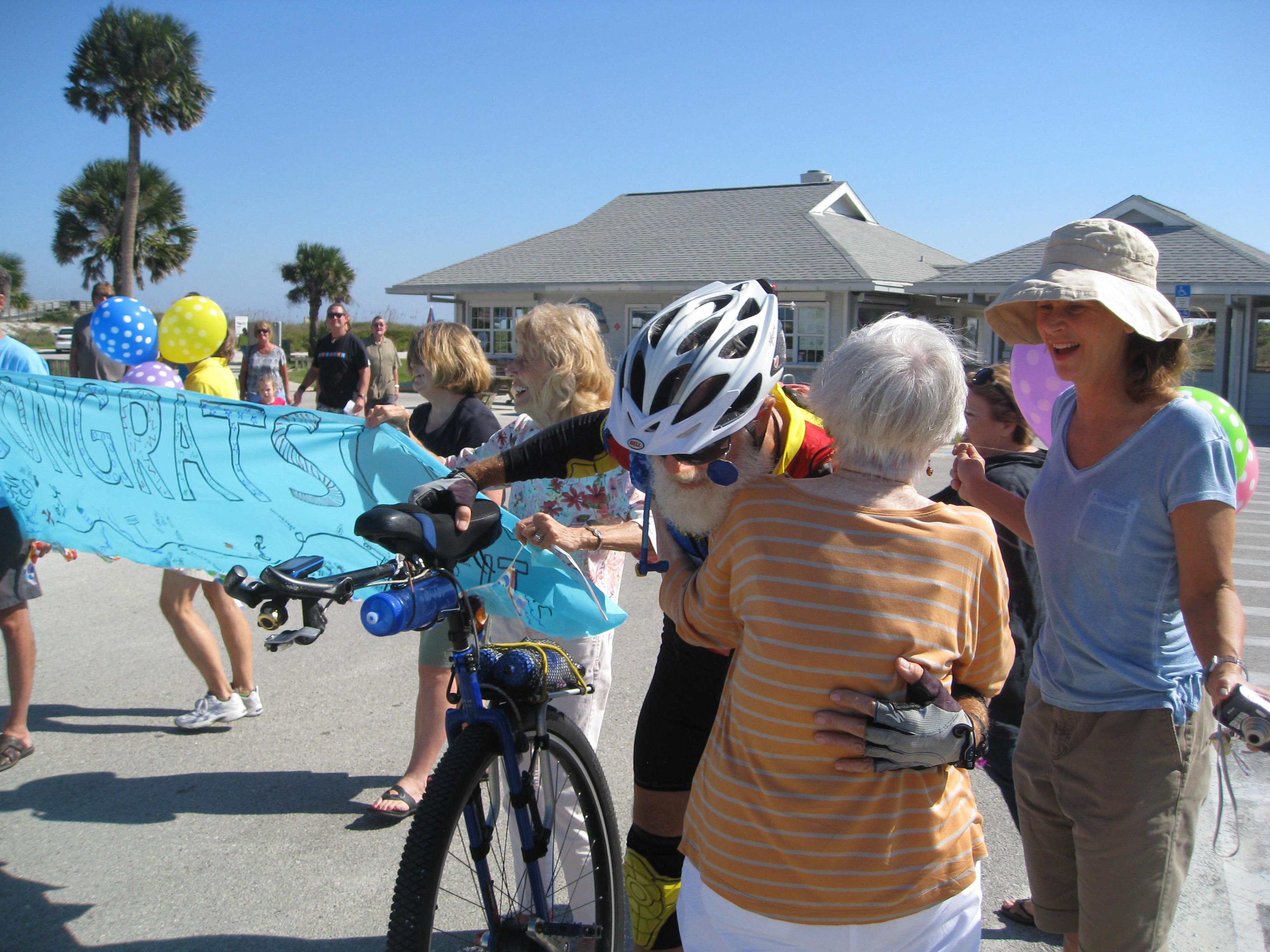 After crossing the bridge I headed toward Anastaisa Park, then another motorist stopped me. He had read the article and wanted to congratulate me and take a picture. All this frolicking put me a little behind schedule so I kicked into high gear to ride to the Atlantic. When I passed the ranger station in the park, the ranger blew on a party favor and said everyone was gathered at the end. My adrenaline started pumping and now I was riding at 16 mph over the bumpy park road.