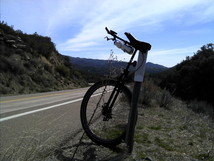 My unicycle taking a rest on day 4 before descending into Alpine CA