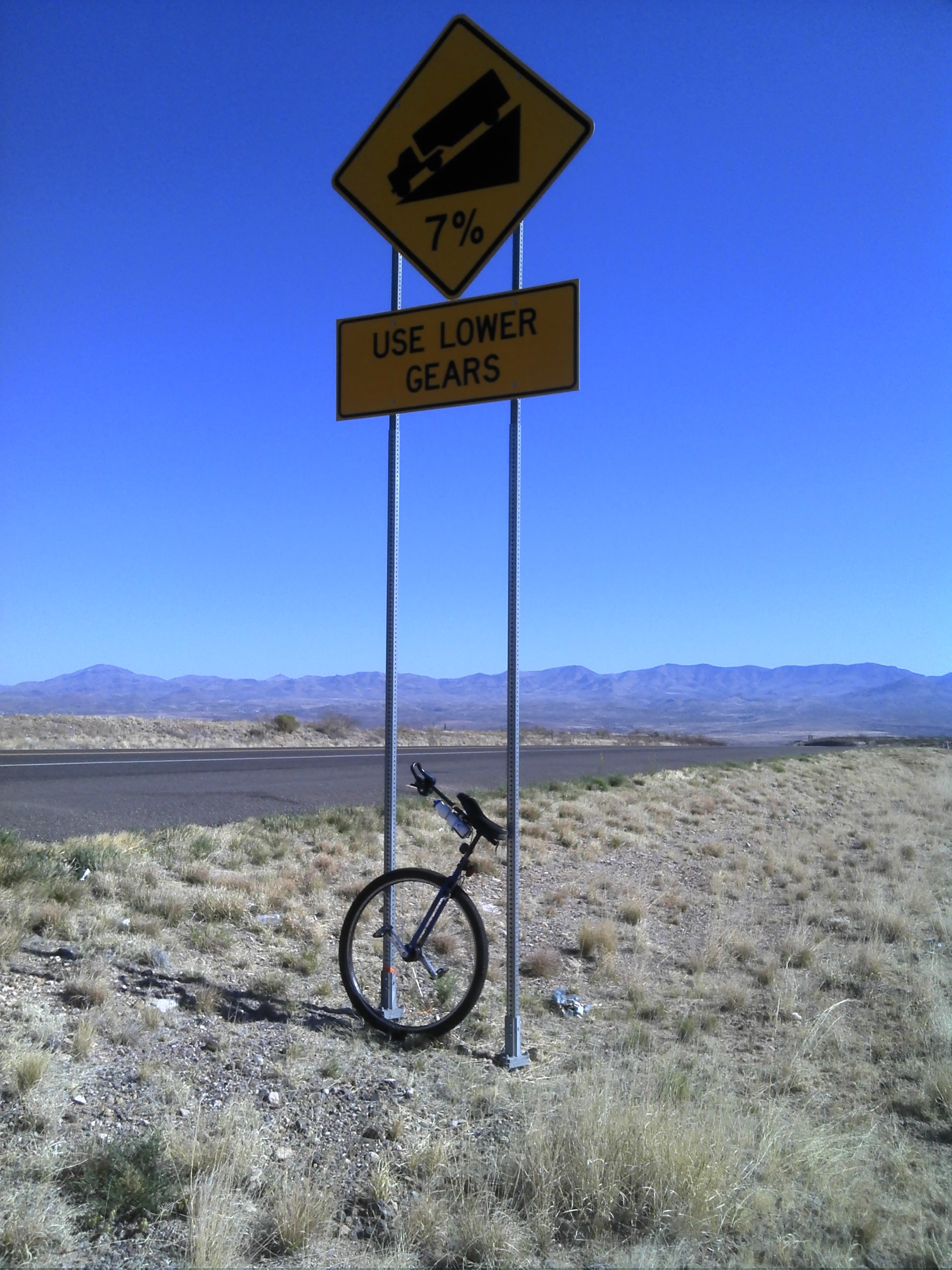 Day 25 started out at the top of the bell about 4600 feet and quickly began to descent rapidly. The sign said 7% grade use low gear. So I did. I was inching down in low using by brake when the camber of the road shifted so I went to switch hands on the brake.