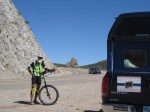 The Tale of the second ride. I was now headed from an elevation of about 3500 feet to ride to the top of the second bell at 6200 feet. Route 78 was relatively smooth but had narrow to nonexistent shoulders. Fortunately I encounter the least traffic on the trip so far. It appears no vehicles like climbing this pass. I pedaled along slogging my way up the switch backs in low gear on the KH 36, thinking may I should try the Schlumpf 29. My crew and I leapfrogged up the hill. I pedaled and she played paparazzi. With about 500 more feet of elevation to climb, I wimped out and finished the climb on the 29” in low gear.