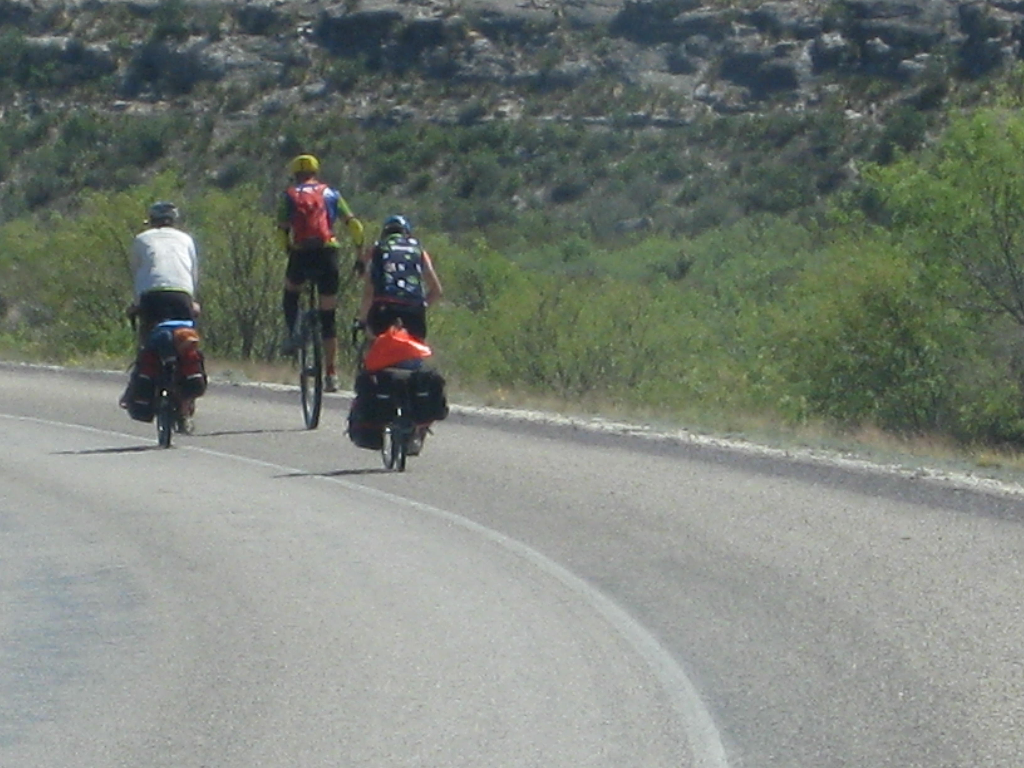 The night before we met Ron and Natasha headed the same way I am on their bikes. This morning I cheated by starting where I left off the day before 6 miles and 50 minutes ahead of them in the race (not really) to Sanderson TX. As it turns out I rolled into Sanderson about 5 minutes ahead of them. I think they were a little surprised they didn’t see me sooner. Of course my crew beat us all and had already sucked down a chilidog.
