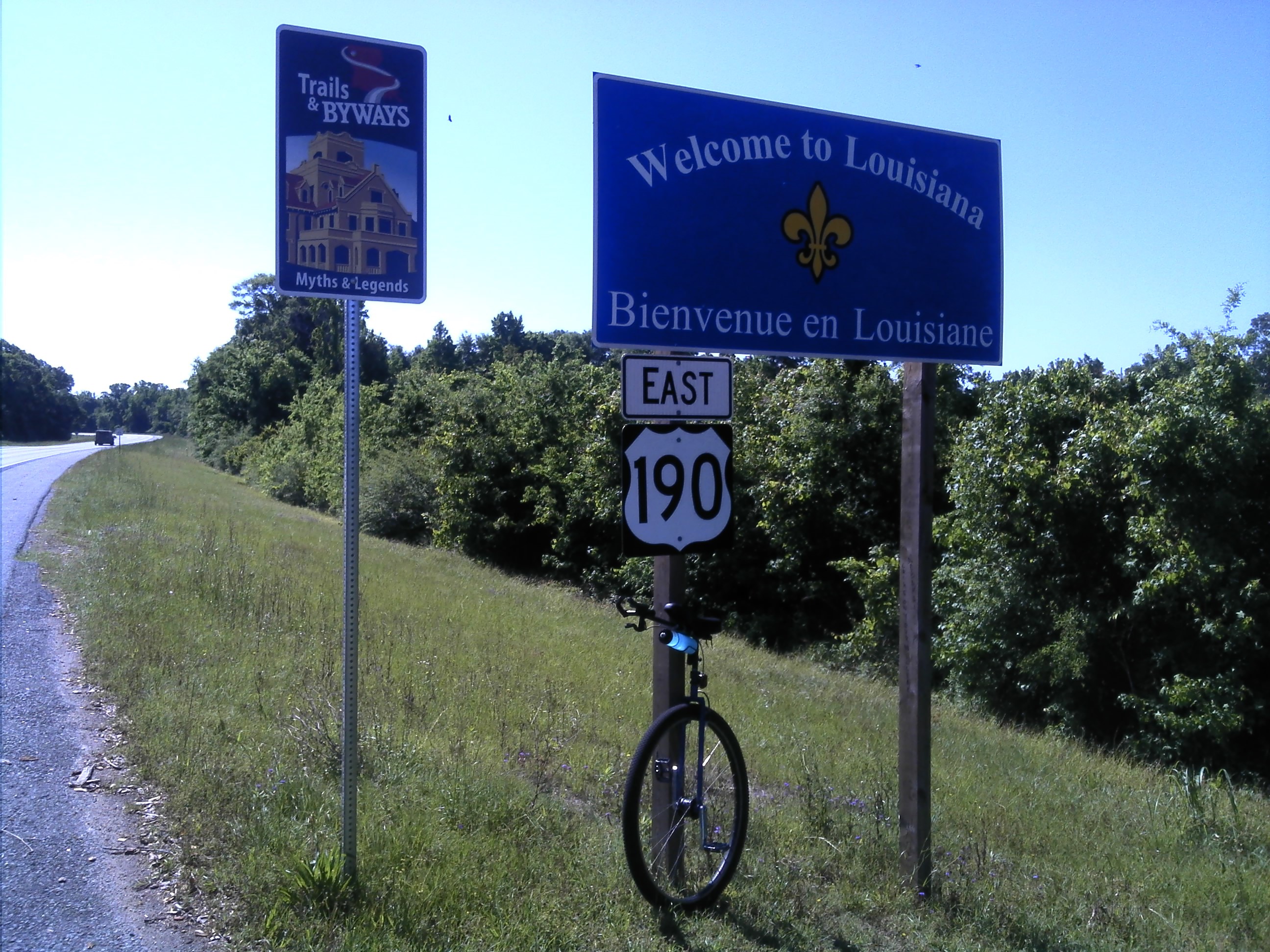 I rode three miles into Louisiana when I saw a trooper pull over ahead of me.  He turned his lights off and just stayed in the shoulder.  I thought maybe he wanted to talk to me but as I road up he didn’t get out of his car so I just went out into the road around him since he was blocking my path.  His window was down so I said good morning as I rode by.  He never uttered a sound.  I guess if you have seen one cross-country unicyclist you’ve seen them all.