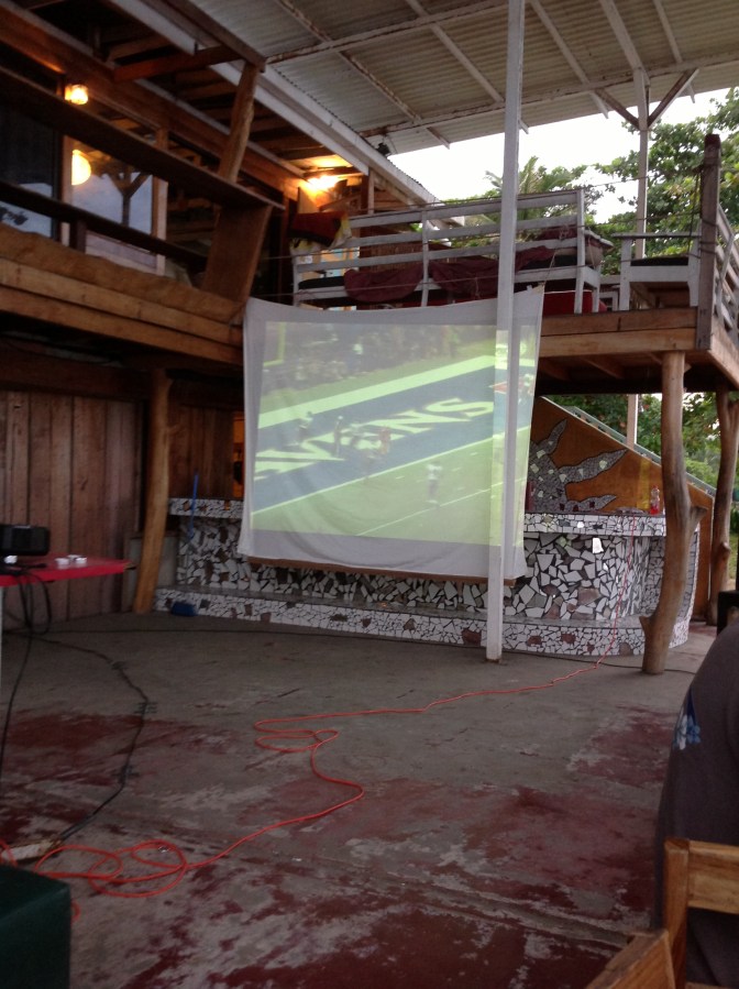 Watching the Superbowl on a sheet in Spanish at the Lazy Mon in Peurto Viejo